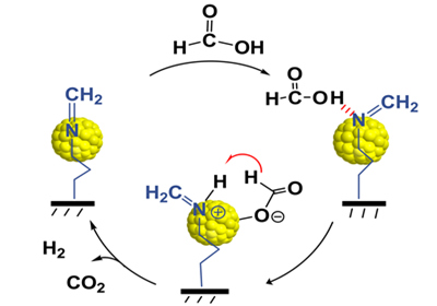 高浓度甲酸甚至无水液体甲酸体系因存在较强的分子间氢键作用,故不利于脱羧反应的进行。因此,目前报道的多相及均相催化剂分解甲酸制氢时,均需要碱助剂或在低浓度的甲酸溶液中进行,而这会大大削弱甲酸体系的氢释放量,不利于实际应用。本研究表明:在表面席夫碱与Au的协同作用下,吸附在其界面处的甲酸分子可以方便的发生解离及H+促进的β-H断裂,高选择性地产生H2和CO2,该过程无需其它助剂且可在高浓度的甲酸中进行。纳米金与表面席夫碱的这种独特作用机制及在其它催化领域中的应用研究正在进行中。