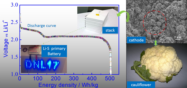 近日,我所储能技术研究部张华民、张洪章研究团队,成功开发出基于大孔容、高比表面、梯度有序多孔碳材料的碳硫复合正极,用其研制的锂硫一次电池能量密度达到500Wh/kg(650Wh/L)以上。相关研究成果“Lithium Sulfur Primary Battery with Super High Energy Density: Based on the Cauliflower-like Structured C/S Cathode”在线发表在Scientific Report(2015,5,14949)上。