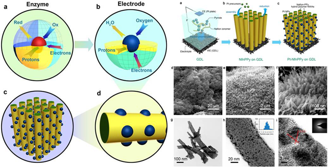受到酶催化剂中活性中心与传质通道复合微观结构的启发,该研究团队将铂的纳米粒子原位锚定于具有电子传导与质子传导功能的双导体纳米阵列界面区域,形成了在纳米尺度上同时具有电子、质子、物质传输通道的三相反应界面区,铂催化剂利用率显著提高。另外,铂纳米粒子与载体间的强相互作用改变了铂的电子结构,不仅大幅提高了氧还原反应催化活性,而且使得电极稳定性得到增强。该研究工作为燃料电池多孔电极体系的基本微观结构提供了新的研究思路,同时为其批量化的工业应用打下了基础。