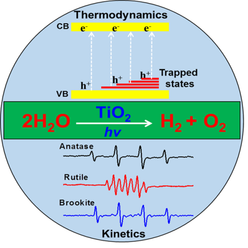 TiO2是光催化研究中的最为典型的模型半导体光催化剂,其热力学上完全满足分解水的要求,但是将TiO2用于光催化分解水的研究却难以实现分解水产氢产氧。研究团队选取这一模型光催化剂作为研究对象,系统考察了不同物相TiO2(锐钛矿相,金红石相,板钛矿相)的光催化分解水性质。研究发现只有金红石相TiO2在光激发下能实现完全分解水,H2与O2符合化学计量比,而锐钛矿和板钛矿相TiO2均不能实现完全分解水,反应过程中只能生成H2,而不能生成O2。但是,当锐钛矿和板钛矿相TiO2在经过长时间强光照处理后却能实现分解水同时得到H2与O2。进一步通过瞬态吸收光谱(TAS)、电子自旋共振(EPR)、时间分辨红外-激发能量扫描谱(TIRA-EESS)以及理论计算(DFT)等多种表征手段发现,不同物相TiO2光催化分解水性能的巨大差异是由热力学和动力学因素共同决定的。