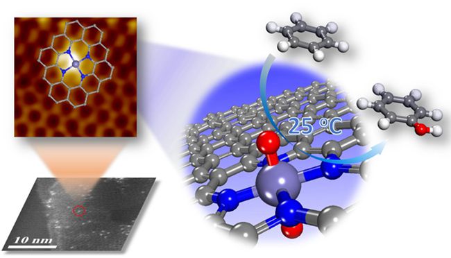 该研究团队经过五年多的探索,通过高能球磨酞菁铁分子与石墨烯纳米片,通过控制球磨条件,巧妙地利用N原子与石墨烯的C原子形成强的共价键,使得N原子作为一个“锚”来稳定配位不饱和的铁中心。通过与东南大学孙立涛教授研究组,中科院物理所李建奇研究员研究组,加拿大光源,上海同步辐射光源,以及我所1501组的王军虎研究员等人合作,首次观察到FeN4在石墨烯骨架中的原子结构。该工作进一步的理论计算表明,形成的FeN4结构能够在石墨烯骨架中有效稳定,并且能高效分解双氧水,形成O=FeN4=O活性中心,进而可以在室温甚至0 oC下催化苯氧化生成苯酚。该研究结果给低温下高效选择氧化的非贵金属催化剂的设计提供了新的研究思路和借鉴。