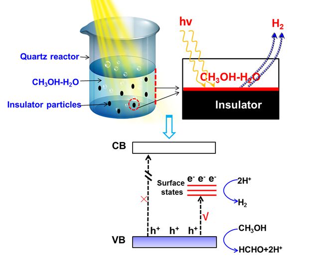 光催化制氢研究领域通常采用CH3OH作为产氢半反应的牺牲剂以探测光催化剂的质子还原反应能力。但在本工作中,研究人员用光催化反应研究广泛使用的石英反应器,在高压汞灯作为光源、在没有加入任何光催化剂的空白反应实验中观察到氢气的生成;随后通过反应条件的调变(溶液浓度、pH值、激发波长以及不同波长激光作为光源等条件的调控),确认了H2的产生源于石英反应器与甲醇水溶液的界面上。为了增大绝缘体与溶液的接触界面,研究人员在反应体系中加入绝缘体的颗粒(SiO2,Al2O3等)并担载少量Pt作为产氢助催化剂时,发现产氢的量可以得到大幅度提升;从而确认在激发光源能量远小于绝缘体带隙的条件下,绝缘体表面显示出光催化重整甲醇制氢的活性。