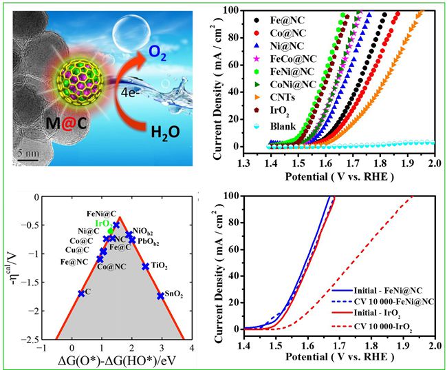 氢能源是一种清洁、高效、可再生的理想能源,电解水制氢是实现工业化廉价制备氢气的重要手段。电解水过程包含析氢和析氧两个半反应,其中由于析氧反应过程在动力学上的困难性成为了电解水制氢的瓶颈。目前商用的析氧催化剂主要为IrO2和RuO2等贵金属,其高昂的价格和稀有的储量制约了这一过程的发展,寻找价格低廉和储量丰富的非贵金属催化剂成为近年来研究的热点。近日,我所催化基础国家重点实验室邓德会副研究员和包信和院士带领的研究团队在长期深入研究碳纳米材料催化的基础上,利用SBA-15的孔道对金属纳米颗粒尺寸的限域作用,通过化学气相沉积法成功实现了均一的单层石墨烯壳层封装3d过渡金属及其合金纳米粒子,所制得的单层石墨烯封装铁镍合金催化剂的活性和稳定性均优于商品的IrO2催化剂。相关结果以通讯形式发表在Energy & Environmental Science上 (Energy Environ. Sci., 2016,DOI: 10.1039/C5EE03316K)。