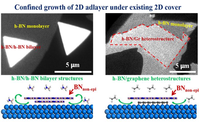 两维原子晶体及其异质结结构近年来受到广泛关注,然而该结构的可控制备是这领域中的一个挑战。近年来傅强研究员、包信和院士带领的研究团队利用实验室自行研制的光发射电子显微镜/低能电子显微镜(PEEM/LEEM)并结合其他表面技术开展了两维原子晶体表界面过程的原位动态研究,发现两维原子晶体与固体表面形成的两维空间可以作为表面反应的纳米反应器,并提出了“Chemistry under Cover”的概念(Angew Chem Int Ed 2012, 51, 4856; PNAS 2014, 111, 17023; Nano Lett 2015, 15, 3616)。根据这一概念,该团队探索在两维原子晶体限域空间中进行另外一类两维原子晶体结构的生长,成功制备了BN/石墨烯等异质结结构。这一结果表明可以通过在层状结构之下限域生长实现不同两维原子晶体的堆垛结构,为构建两维原子晶体异质结结构提供了一条新途径。同期中ACS Nano编辑在In Nano栏目中对这一工作做了重点介绍(http://pubs.acs.org/doi/full/10.1021/acsnano.5b07283)。