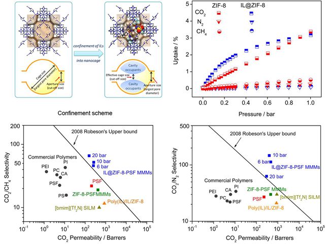 在上述研究基础上,该团队将IL@ZIF-8纳米基元与聚合物复合成有机-无机复合膜,其对CO2/CH4和CO2/N2混合气体的分离性能显著提高,突破了聚合物膜的分离性能上限。该项研究不仅在天然气纯化和CO2燃烧后捕获领域展现出良好的应用前景,而且有望拓展到其他基于MOFs材料的选择性吸附和膜分离研究中。