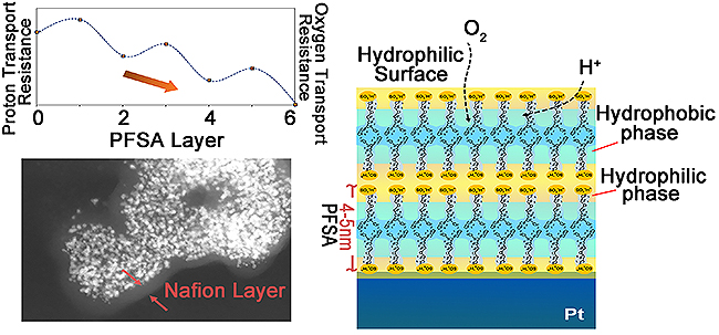 该团队在前期电极界面结构及物质传输研究基础(Nano Energy, 2019, 65: 104048; J. Mater. Chem. A, 2020, 8: 1113; J. Mater. Chem. A, 2017, 5: 15260)上,创新性地利用Cs离子交换染色技术,结合STEM显微成像分析,实现了多孔电极中离聚物(Nafion)/Pt界面微观结构的精细表征。进一步结合化学吸附脉冲滴定与电化学变量分离方法,发现该Nafion/Pt界面层中质子/氧传输性能呈现出周期性演变规律。基于该规律分析,首次在纳米尺度建立了界面层中离聚物亲水相和疏水相交替暴露的界面模型。该研究的发表将促进质子交换膜燃料电池高性能低铂电极的发展,为实现其低成本商业化应用奠定理论基础。