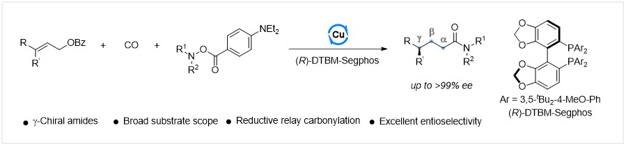 近日,我所生物能源研究部催化羰基化研究组(DNL0604组)吴小锋研究员团队在烯烃不对称羰基化反应领域取得新进展,提出了一种新型铜催化还原接力氢胺化羰基化策略,用于高效合成具有远端手性中心的γ-手性酰胺。