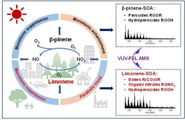 SOA由大气中的挥发性有机化合物(VOC)氧化形成,是大气颗粒物的主要组成部分,严重影响了大气气候、人类健康和交通安全。单萜烯是全球生物源SOA的重要“贡献者”。植物释放的β-蒎烯和柠檬烯是全球单萜烯的主要来源,它们在SOA的形成中作为前体具有关键作用。然而,β-蒎烯和柠檬烯作为单萜烯的同分异构体,NOx对它们的光氧化反应影响差异性机理不明。