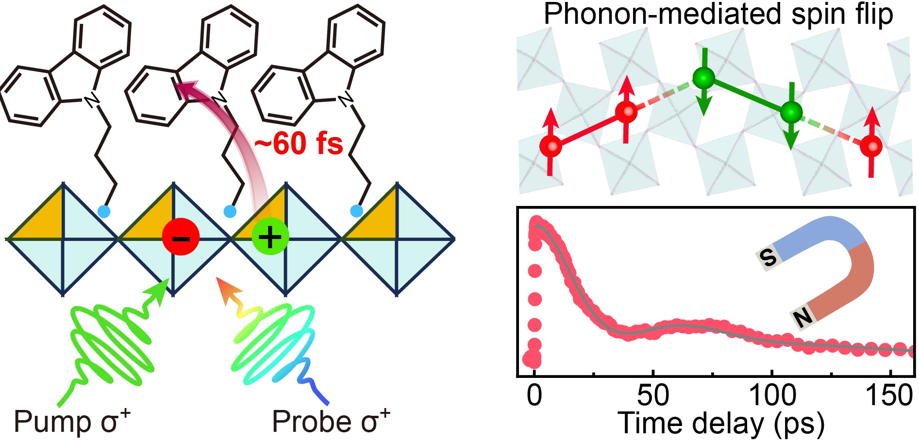 近日,我所化学动力学研究室光电材料动力学研究组(1121组)吴凯丰研究员团队在二维有机-无机杂化钙钛矿自旋调控研究中取得新进展。该团队通过引入共轭有机分子捕获光生空穴,延长了二维钙钛矿中电子的自旋寿命,并在横向磁场下观测到电子的相干自旋进动行为。