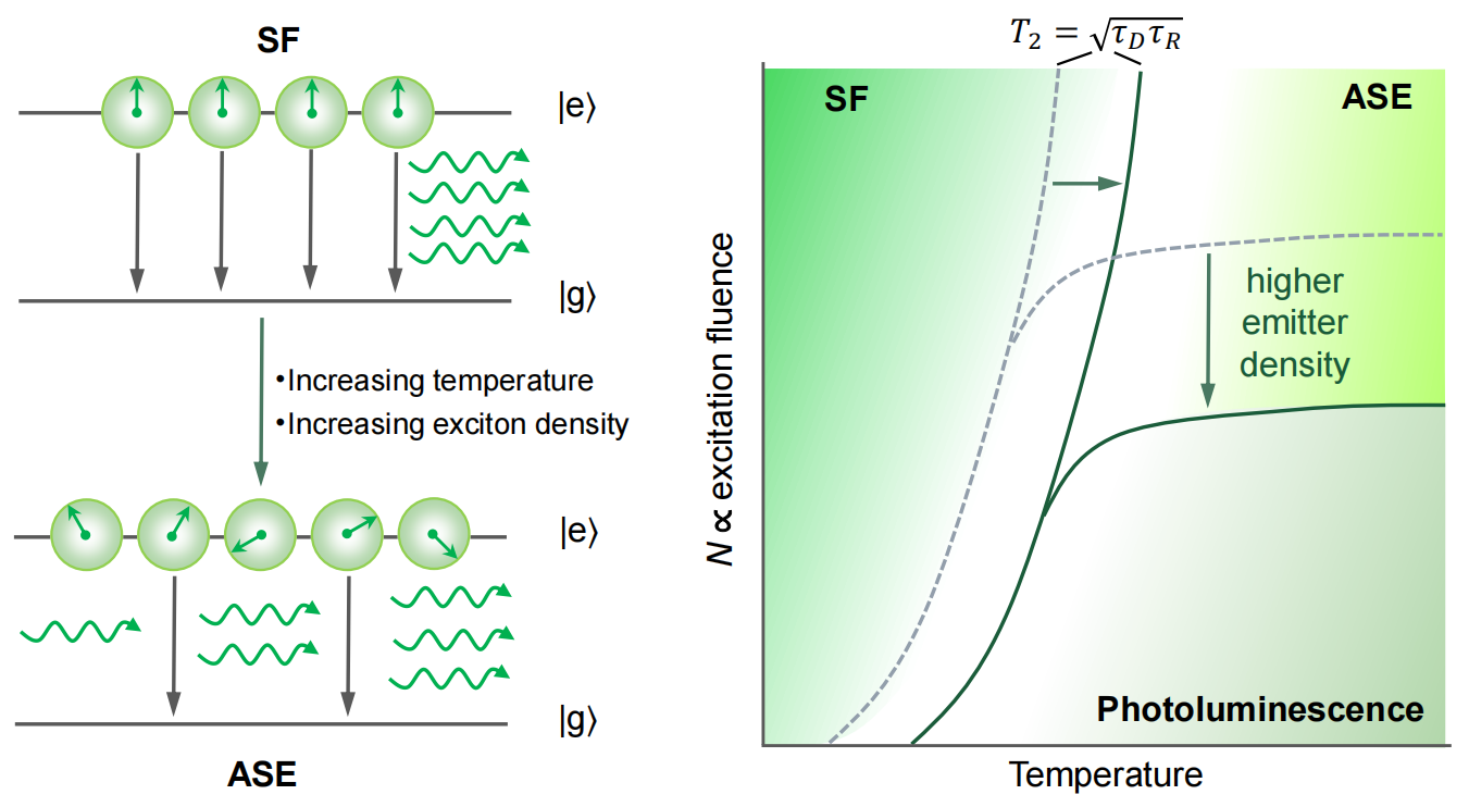 协同发射是量子发射体集体光学行为研究中的重要前沿方向,在超快、高亮度光源,以及量子光子学等领域具有潜在应用价值。其中,超荧光(SF)表现为激发态偶极自发实现相位同步,并以宏观相干极化的形式实现高强度、高速率的集体辐射;而放大自发辐射(ASE)源于自发辐射光子在增益介质中的连续放大,其形成并不要求各发射体之间保持相位一致。尽管二者机制不同,但都体现了区别于独立量子发射体的整体辐射行为。