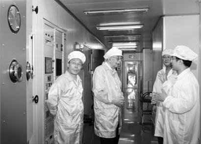 ↑张存浩院士(左二)在中国科学院大连化学物理研究所 (2013年7月摄)。 □新华社发