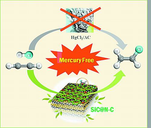 近年来,世界上很多国家竞相进行重点攻关,试图开发非汞催化剂,实现聚氯乙烯的无汞化生产。中科院大连化物所研究员潘秀莲和中科院院士包信和带领的研究组,通过精确控制碳化硅材料的处理过程,在其界面制造纳米碳结构,并采用氨化等方法实现了氮原子在碳结构中的原位掺杂。在碳化硅表面形成的这种氮掺杂的类石墨烯材料,显示出优良的直接催化乙炔氢氯化的性能。