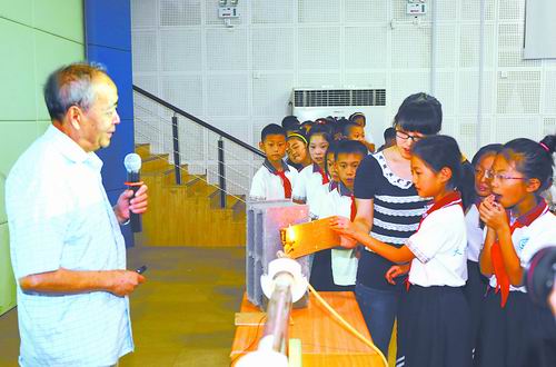 9月11日,在大连格致新校,中科院院士沙国河(左)与学生们一同体验奇妙的科学实验。孩子们亲眼目睹了激光的力量,看二氧化碳激光器是怎样发射肉眼看不见的红外光,瞬间将木头点燃。