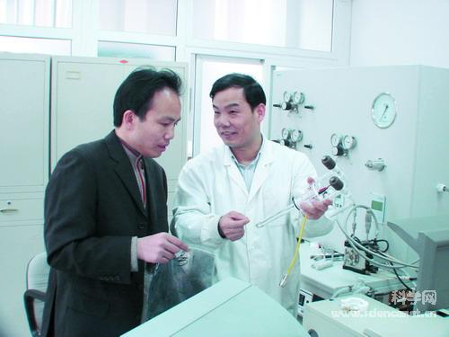 图为大连化物所技术人员(右)与企业负责人就检测样品进行交流。