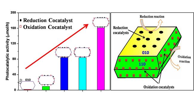 基于前期发现的半导体光催化剂的不同晶面之间光生电荷分离效应,本工作将不同的氧化和还原双助催化剂分别高选择性地担载到光催化剂BiVO4的(110)和(010)不等同晶面上,将光催化氧化水的活性提高两个数量级以上。研究发现:分别只担载一种助催化剂时,可将活性提高到一定程度,只有当双助催化剂选择性地担载于特定晶面时才会表现出明显的协同促进作用,使光催化氧化水反应活性大幅度提高。将这一策略制备的光催化剂用于光催化氧化降解多种污染物的反应中也同样发现可以显著提高光催化反应活性,进一步确认了双助催化剂在不同晶面选择性担载的协同促进光催化反应的机制,从而为理性设计合成半导体基光催化体系以实现高效光催化分解水提供新的策略。