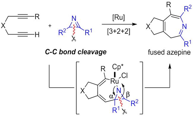 近年来,万伯顺研究员团队一直致力于发展催化杂环合成的新方法新策略,并成功实现了氮杂五元环(Angew. Chem. Int. Ed.2012,51, 1693;Angew. Chem. Int. Ed.2015,54, 10613)、六元环(Angew. Chem. Int. Ed.2011,50, 7162)和桥联八元环(Angew. Chem. Int. Ed.2014,53, 11940)化合物的选择性合成。然而通过环加成反应构建七元含氮杂环化合物一直是该领域的研究难点。研究组在前期工作中发现,二炔(diyne)与三原子合成子的环加成反应很难构建七元环化合物,反应通常停留在[3+2]环加成阶段生成五元含氮化合物(Chem. Commun.2013,49, 5073)。为了解决这个问题,该研究组尝试选用氮杂丙烯啶作为合成子。通过研究发现,在钌催化剂条件下,氮杂丙烯啶可以和二炔发生[3+2+2]环加成反应得到氮杂七元环吖庚因类衍生物(azepines)。该反应可以在室温下发生,条件温和、底物范围广、具有高度专一选择性。反应过程中氮杂丙烯啶通过β-碳消除的方式发生C–C单键断裂,从而作为三原子合成子参与到环加成反应中。该研究为深入了解氮杂丙烯啶化学以及进一步构建和发展其它杂环化合物提供了新的思路。