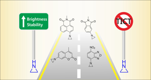 荧光染料广泛应用于生物分子标记,通过所见即所得(seeing is believing)的方式跟踪生物分子,研究功能生物分子的位置和作用。荧光染料的光强度和光稳定性是影响成像质量的首要因素,特别是以超高分辨为技术支撑的单分子荧光成像的快速发展,对荧光染料的光强度和光稳定性提出了更高的要求。然而,现有的大多数荧光染料缺乏足够的光强度,少数高荧光强度的染料在光稳定性方面的不足限制了对细胞的长时间观察。理论研究已经证实,光照扭转分子内电荷转移(TICT)是荧光染料非辐射跃迁的主要方式。针对此问题,该研究团队通过实验与理论计算相结合的方式,将荧光染料中常用的电子供体二烷基胺变换为三元环的氮丙啶,由于氮丙啶巨大的环张力和空间位阻,有效的阻止了染料受光照激发后TICT态的形成,从而极大地提高了荧光强度和光稳定性。