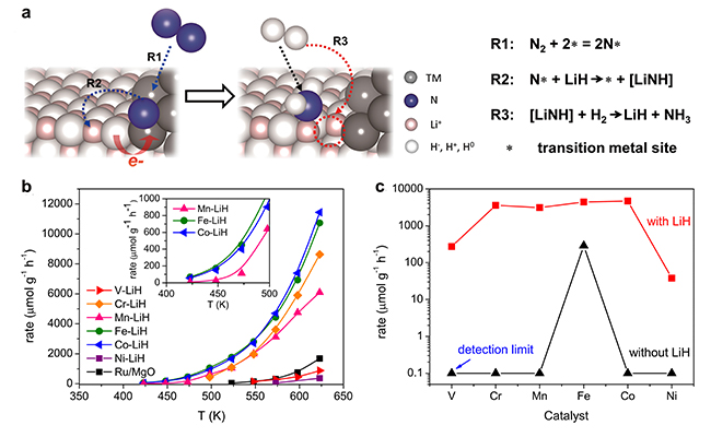实验结果显示,由于LiH的介入,第一周期过渡金属及其氮化物(从VN到Ni)均显示出较高的活性。尤其是CrN-、Mn4N-、Fe-和Co-LiH等,在350°C下其催化活性显著优于现有的铁基和贵金属钌基催化剂。需要指出的是,Fe-LiH和Co-LiH在150°C即表现出可观量的氨合成催化活性,证明了双中心作用机制下氨的低温合成。该复合催化剂体系中,LiH明显不同于传统的碱金属添加剂,即其直接作为活性中心而非电子助剂参与催化过程。这一结果亦为长期具有争议的碱金属助剂在合成氨中的作用机制问题提供了新的视角。