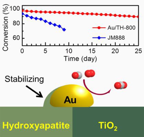 近期,张涛院士团队和王军虎研究员团队发现Au与HAP在高温氧化条件下可以形成SMSI,引发载体对金纳米粒子的包裹(J. Am. Chem. Soc.2016,138,56-59),提高了金纳米粒子的稳定性;但是,过度的包裹会覆盖活性位,从而降低催化活性。为解决这一问题,研究团队向HAP中掺入活性载体TiO2,调节HAP与Au之间的强相互作用,既改变了纳米粒子的包裹程度,又提供了高活性反应位点,从而研制出同时具有高活性和高稳定性的负载金催化剂Au/TiO2-HAP。该催化剂经800℃高温焙烧后仍具有可观的CO氧化活性,且对一系列高温反应表现出优异的反应稳定性。在模拟汽车尾气的CO消除测试中表现出优于商业三效催化剂的反应稳定性。研究结果还表明,该催化剂中Au纳米粒子位于HAP与TiO2两种载体的界面之间:这种特殊构型使金纳米粒子靠近HAP的一侧由于SMSI作用被HAP包裹,确保了催化剂优异的抗烧结性和稳定性;同时,靠近TiO2一侧裸露,可以与反应底物直接接触,确保了催化剂的高活性。该催化剂不仅显示出潜在的实用性,更重要的是,该催化剂的设计与制备开辟了一条通过调节SMSI效应制备兼具高稳定性与高活性金催化剂的新途径。