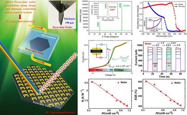 根据半导体行业对于钙钛矿单晶片的市场需求,该研究团队首次利用流动溶液微反应系统,实现了厚度和形状可控的钙钛矿CH3NH3PbI3单晶薄片的制备。与微晶钙钛矿光电器件相比,用钙钛矿单晶薄片组装的集成电路型光探测器具有更好的光响应和更高量子效率,且光谱响应范围更加宽广。同时,该集成电路型光探测器在工作稳定性方面也具有明显的优势。