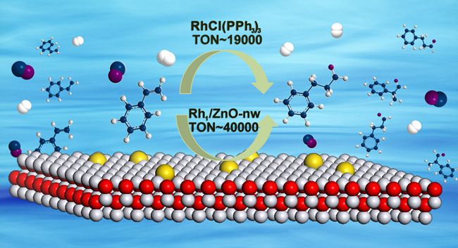 通过氢甲酰化由烯烃和合成气制备醛类精细化学品,是化工生产中最重要的均相催化过程之一,该类精细化学品年产超千万吨,具有非常重要的应用背景。近期,郎睿博士在乔波涛副研究员和张涛院士指导下,成功合成出氧化锌纳米线负载的铑单原子催化剂(Rh1/ZnOnw),可在温和的反应条件下将苯乙烯转化为苯丙醛,催化效率与经典的均相催化剂(Wilkinson's催化剂,Rh(PPh3)3Cl)相当。该过程中没有发生烯烃C=C双键加氢的副反应,故化学选择性高达99%,此外该体系还具有较好的底物适用性和稳定性。透射电镜、原位红外等表征手段证明Rh在载体上是以单原子的形式分散。该研究首次从实验上证明单原子催化剂可能成为沟通均相催化与多相催化的桥梁,为均相催化剂的多相化开辟了新途径,同时也为单原子催化剂的应用提供了新思路。