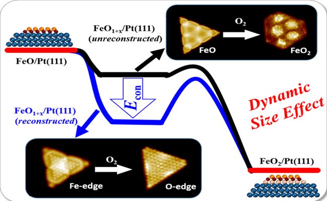 该研究团队通过在Pt(111)表面构建不同尺寸、结构高度规整的FeO纳米结构并研究其深度氧化的动力学,发现直径3nm以下的FeO纳米粒子表现出更好的抗氧化能力。利用高分辨扫描隧道显微镜(STM)结合DFT理论计算,该团队首次发现了尺寸相关的纳米结构动态变化及其在纳米粒子氧化过程中的决定性作用。研究还发现,尺寸在3.2nm以下的FeO纳米粒子在边界的配位不饱和Fe2+解离O2的同时会发生整体的再构,使解离的氧原子稳定在边界而难以钻入FeO和Pt之间的界面,从而减缓了FeO的深度氧化过程。而对于尺寸在3.2nm以上的粒子,由于无法完成整体再构,形成表面位错且难以稳定边界氧原子,反而更容易被进一步氧化。也就是说,小纳米粒子在反应中更容易动态变化,达到相对稳定的结构构型,这种“动态尺寸效应”使小纳米粒子表现出了反常稳定性。此外,该研究团队还研究了负载在Pt(111)或Au(111)上的CoO纳米结构,也发现了类似的3nm以下粒子的抗氧化行为,说明这种动态尺寸效应对于负载型过渡金属氧化物纳米结构具有一定的普适性。该项研究不仅为纳米催化剂在气氛下的动态重构机制带来了原子级认识,也为发展抗腐蚀抗氧化纳米防护涂层提供了一种新的界面调控思路。