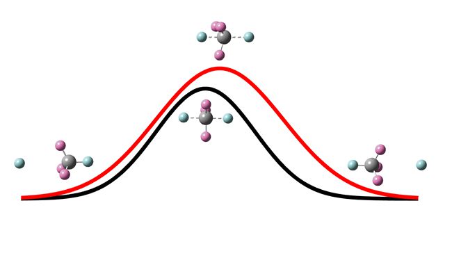 发生在四面体环境碳原子上、经由背面攻击瓦尔登翻转机理实现的反应是化学中最重要和最有用的一类反应。双分子亲核取代反应(SN2)是该类型中最常见的一种。在一个SN2反应中,亲核试剂(通常带负电荷)从一侧接近饱和的碳原子,置换碳原子对面一侧的离去基团,导致碳中心的翻转和分子手性的变化。数十年的大量研究表明具有中心势垒的气相SN2反应表现出反向二级动力学同位素效应(即当同位素取代的原子并没有直接参与反应时,室温下的速率常数kH/kD<1),而反应截面表现出较强的正向二级同位素效应,同时反应的阈值能量远大于计算的势垒高度。然而,造成动力学和反应截面同位素效应差异以及高能量阈值的原因一直没有得到阐明。