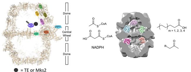 该研究团队前期通过对产油酵母多组学研究发现,圆红冬孢酵母携带一种含两个酰基载体蛋白(ACP)结构域的FAS(Nat. Commun.2012,3,1112);通过冷冻电镜分析表明,该FAS也组装成典型笼状结构(Protein Sci.2015,24,987)。近期研究发现,只需一个ACP即可行使脂肪酸合成功能。因此,研究人员用细菌来源的硫酯酶(TE)替换其中一个ACP,所得杂合FAS主要产生中/短链长的脂肪酸;类似地,改造另外两种真菌FAS,也得到了预期结果;更重要的是,利用该策略引入甲基酮合酶(Mks2),所得杂合FAS能合成长链甲基酮。该研究结果表明,将异源蛋白嵌入真菌FAS笼型超分子结构,可得到具有新功能的脂肪酸合成机器,这可为借用脂肪酸合成途径进行生物制造提供新路线。