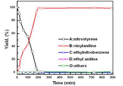 芳胺是合成各种医药、农药、染料、聚合物及精细化学品的重要中间体,其主要通过芳香硝基化合物选择加氢获得。当底物中含有其它不饱和基团时,只还原反应物分子中的硝基而保留其它易还原基团是一个挑战。该研究团队曾采用Pt单原子和准单原子催化剂,通过准确控制反应温度和时间,实现了该过程(Nat. Commun.,2014,5,5634)。但是,由于硝基和其它不饱和基团之间存在竞争吸附关系,随着反应底物中硝基浓度的降低,铂族金属催化剂仍难以避免与其它不饱和基团进行加氢反应。近年来,该研究团队在金催化研究方面取得了较好的积累,金催化剂因其对反应物和产物吸附较弱,在很多反应中表现出较高的选择性(Nano Today,2013,8,403-416;J. Catal.,2013,308,258-271)。但是,将传统金催化剂应用于该反应体系时,在底物完全转化的条件下,目标产物中的其它不饱和基团仍会不可避免地进一步加氢。