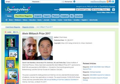 Alwin Mittasch奖由德国催化学会与德国化学工程和生物技术协会共同设立,旨在奖励在催化基础研究和产业化应用领域取得突出成就的科学家。该奖项在全球范围内遴选,每两年授予一次,每次1至2位获奖者。该奖项自1990年设立以来,国际上共有15位科学家获此殊荣,包信和是首位获得该奖项的华人科学家。此次,英国圣安德鲁大学David ColeHamilton教授也获得了该奖项。(文/图 石瑛)