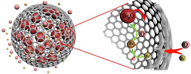 该研究团队设计了一类中空多孔纳米笼状材料,其外壳的孔径介于溴离子和络合态溴之间;利用“孔径筛分效应”,使溴离子在笼内部发生电化学反应后“固定”在内部,从而有效抑制溴的交叉污染。采用该材料组装的单电池在80mA/cm2充放电条件下,库伦效率达到98%,能量效率达到81%。该工作为溴基液流电池电极材料的设计制备提供了新思路。