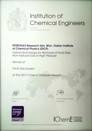 2017年度的IChemE马来西亚奖(IChemE Malaysia Awards 2017)评选于10月16日在吉隆坡举行,我所与马来西亚石油公司(PETRONAS)合作研发的“膜接触器酸性气体脱除项目”(Membrane Contactor for Acid Gas Removal)脱颖而出,获得“油气奖”(Oil and Gas Award)。同时,该项目获奖后自动入围IChemE全球奖(IChemE Global Awards 2017)的“油气奖”最终候选名单,这也是唯一一个来自非英美国家的候选项目。此外,该项目还直接入选了IChemE全球奖的研发项目奖(Research Project Award 2017)最终候选名单。2017年度IChemE全球奖的评选结果将于11月份在英国公布。