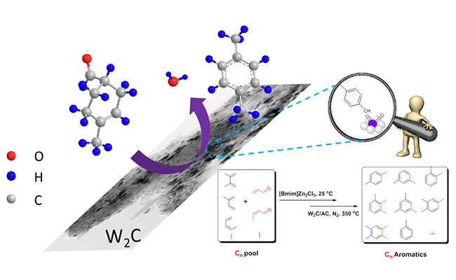 该团队首次报道了以碳化钨为催化剂,通过分子内氢转移,进而实现脱氢芳化和加氢脱氧的高度耦合反应。该过程中的碳化钨表面剪切式反应机理完全不同于传统贵金属催化过程,且碳原子在产物中可100%保留,主要副产物为水,便于PX产物的分离。此进展为探索从生物质资源出发制备芳香化学品提供了一条新思路。