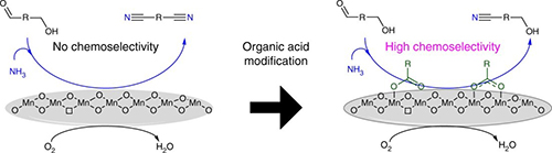 该研究团队长期致力于有机修饰催化剂用于选择性氧化反应和氨氧化反应研究。最新研究发现,将羧基修饰的MnOx用于催化羟基醛氨氧化反应,可以实现醇、醛类化合物催化氨氧化反应的选择性控制。以生物基平台化合物5-HMF催化氨氧化为例,MnOx催化剂未经有机酸修饰时,主要得到2,5-呋喃二腈的衍生产物;而MnOx催化剂经有机酸修饰后,可以抑制羟基氨氧化反应,使得醛基氨氧化产物5-羟甲基呋喃-2-甲腈的选择性达到92%。