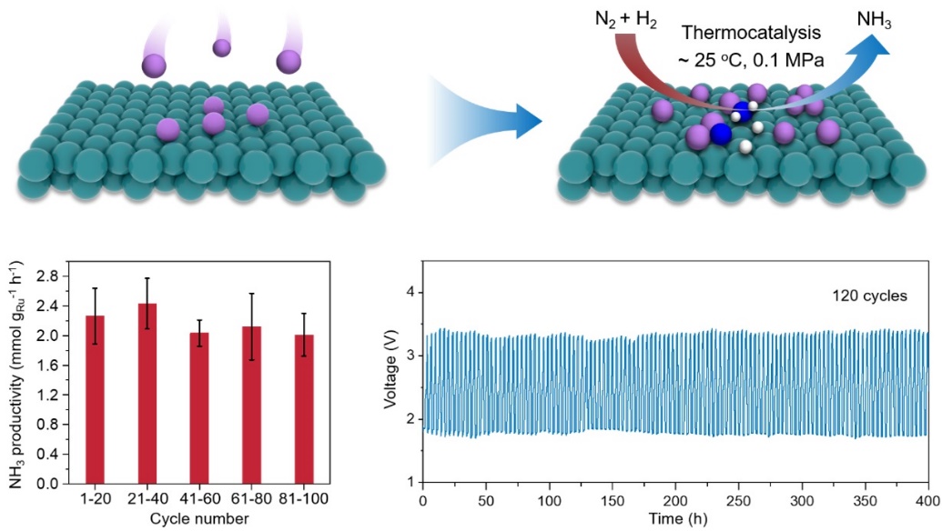 邓德会团队长期致力于能源与环境小分子的催化转化研究,前期在N2、NO等小分子催化转化方面取得了系列进展(Nat. Synth.,2024;J. Am. Chem. Soc.,2025;Nat. Commun.,2025;Joule,2023;Chem Catal,2022;Natl. Sci. Rev.,2022;Angew. Chem. Int. Ed.,2020;J. Energy Chem.,2026)。针对上述挑战,在本工作中团队首先利用模型催化体系将Li金属原子沉积在金属Ru表面,构建了高活性的金属Li/Ru界面,发现Li向吸附态N2反键轨道的电子填充促进了N2分子在Li/Ru界面处的活化和解离,同时Li与NHx物种的键合作用减弱了Ru-N键,有利于NHx物种的加氢和氨的脱附,从而实现了常温常压下的热催化N2与H2合成氨反应。在此基础上,团队进一步设计了以金属Li为阳极、碳纳米管负载Ru纳米颗粒为阴极的可充电锂电池体系,通过电池放电原位生成金属Li/Ru界面,并引入N2和H2混合气,在常温常压条件下的氨生成速率达2.43 mmol gRu-1 h-1。通过电池充放电循环原位再生Li/Ru界面,该合成氨过程可稳定运行超过400小时。该研究为建立温和条件下的可持续合成氨过程提供了新途径。
