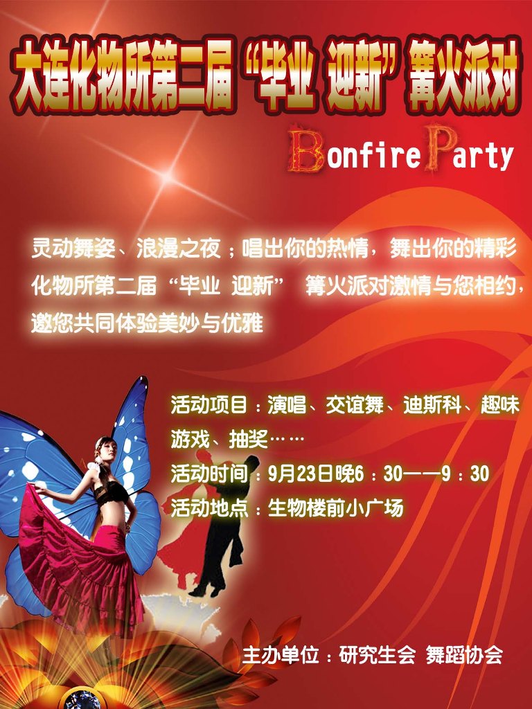 又到金秋时分,在这收获的季节,一张张熟悉的面孔将随毕业而离我们远去,一张张新入学的陌生面孔又将会变得清晰起来。为了送别毕业生,喜迎新同学,丰富广大职工、研究生的文化娱乐活动,研究生会和舞蹈协会将于9月23号晚18:30-21:30在生物楼前小广场联合举办第二届 “毕业?迎新” 篝火派对,主要内容包括露天舞会、歌曲演唱、趣味游戏等节目,届时还有幸运抽奖活动,欢迎广大师生踊跃参加。
