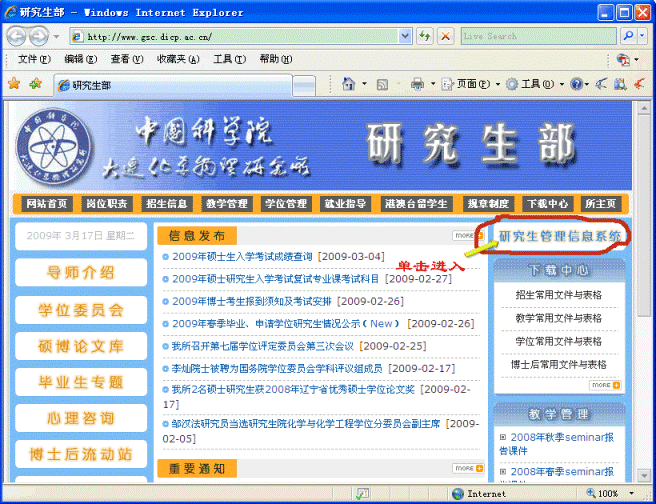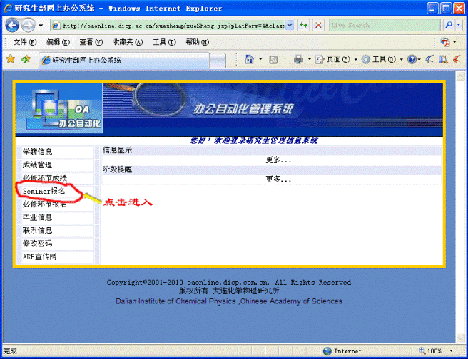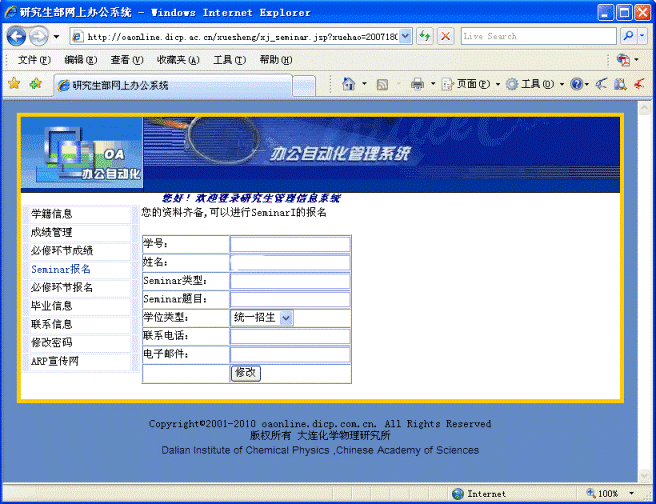 2009年秋季Seminar报名现已开始。请同学们根据《中国科学院大连化物所博士研究生Seminar考核标准》,在确定报名题目后,填写《Seminar 考核报名审核表》,并登录研究生管理信息系统进行网报(流程详见附件),于10月18日中午12:00前完成报名。
