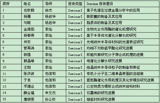 物理化学I学科片SeminarI考核定于11月11日(周三)上午8:15在五室三楼会议室举行,请报名参加本次Seminar考核的同学准时参加。请同学们提前准备并检查PPT,避免出现打不开或文件损坏等影响报告情况,并于报告前一天17:00前将PPT发至jiaoxue@dicp.ac.cn。在报告时注意安排好时间,报告时间请严格控制在15分钟内。