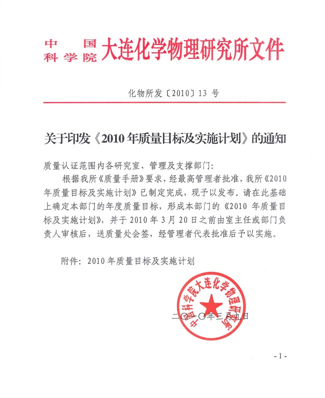 关于印发《2010年质量目标及实施计划》的通知