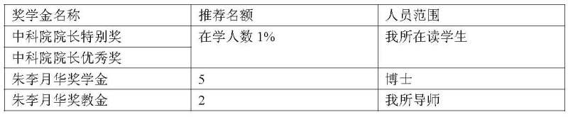 2、评选标准以《中国科学院院长奖条例》和各项冠名奖学金条例以及我所奖学金业务水平评审办法执行(在我所研究生手册中有具体说明),本着“公开、公正、择优推荐”的原则,综合考虑申请者的学术道德、研究成果、综合素质和创新能力等。