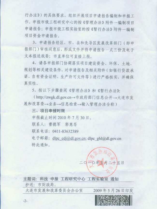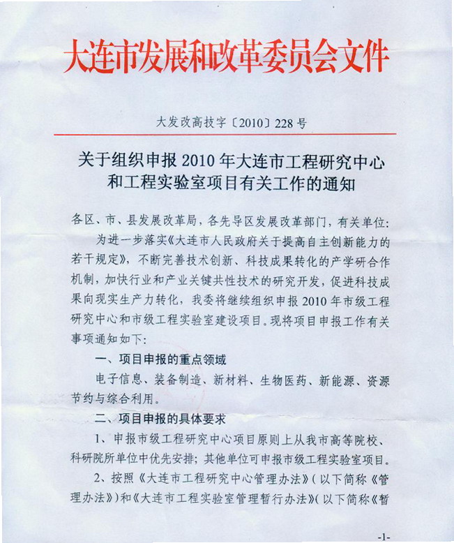 现转发大连市发展和改革委员会“关于组织申报2010年大连市工程研究中心和工程实验室项目有关工作的通知”,有意申报者请于7月25日前将申请报告一式三份及电子文本报送至科技处,由科技处集中上报。