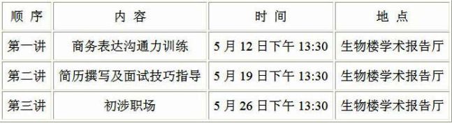研究生部定于5月举办就业指导系列讲座,具体安排如下: