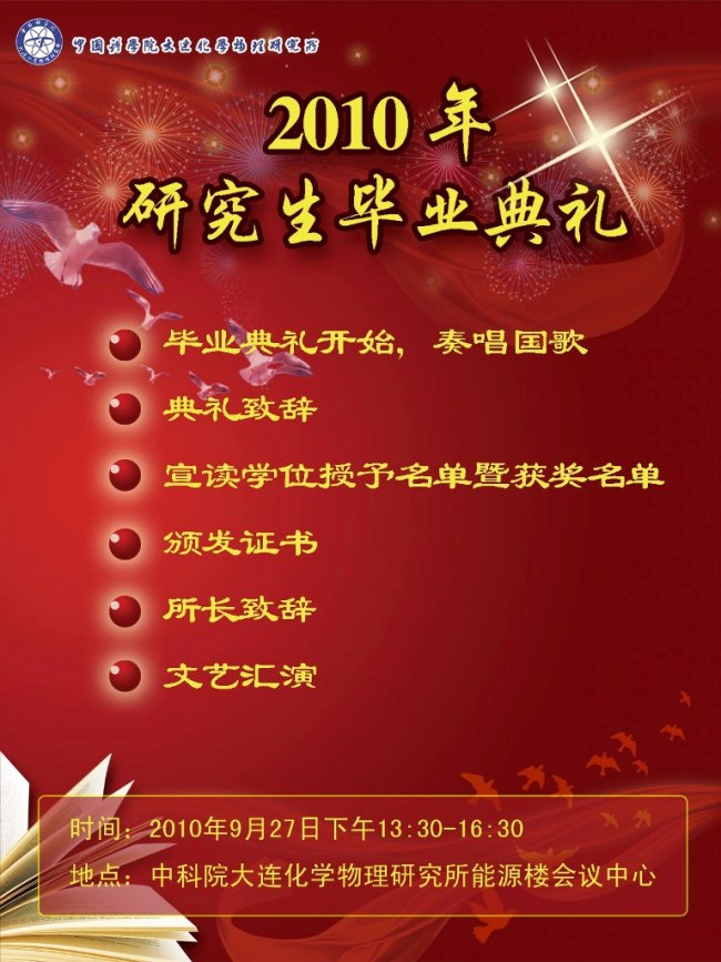 9月27日下午13:30,我所将在能源楼会议中心举行庄严隆重的研究生毕业典礼,届时将邀请中国科学院研究生院领导,大连高校领导,优秀校友,毕业生代表以及研究生代表等出席典礼。为保证毕业典礼按时顺利举行,现将有关人员出席典礼时间通知如下: