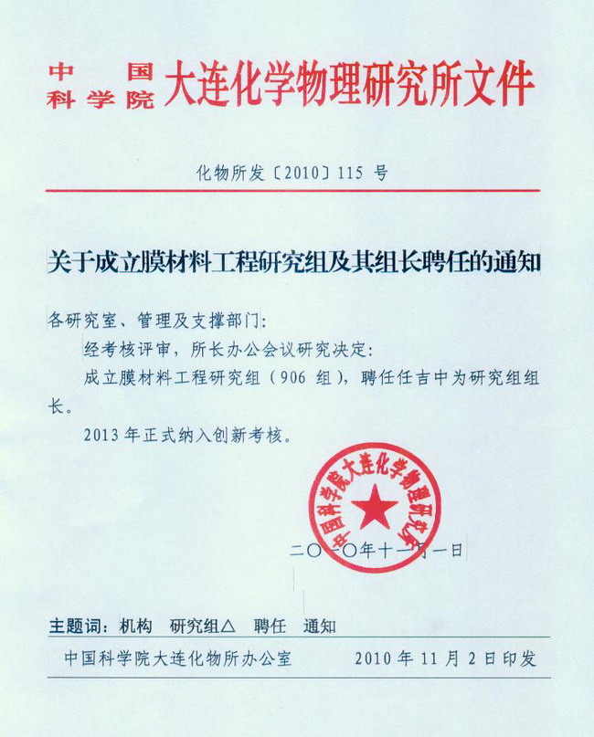 关于成立膜材料工程研究组及其组长聘任的通知
