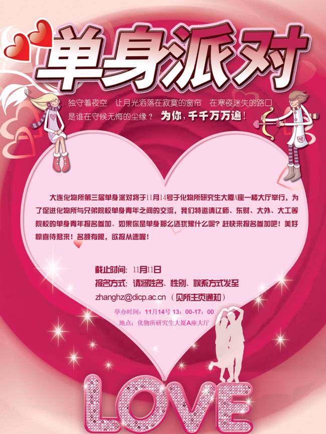 大连化物所的第三届单身派定于11月14日在化物所研究生大厦A座大厅举行,为了促进化物所与兄弟院校单身青年之间的交流,届时我们将邀请辽师、大工、东财、大外等兄弟院校的单身青年报名参加。届时将有充分的交谈、热情的游戏、融洽的棋牌、浪漫的电影等方式增进相互了解,