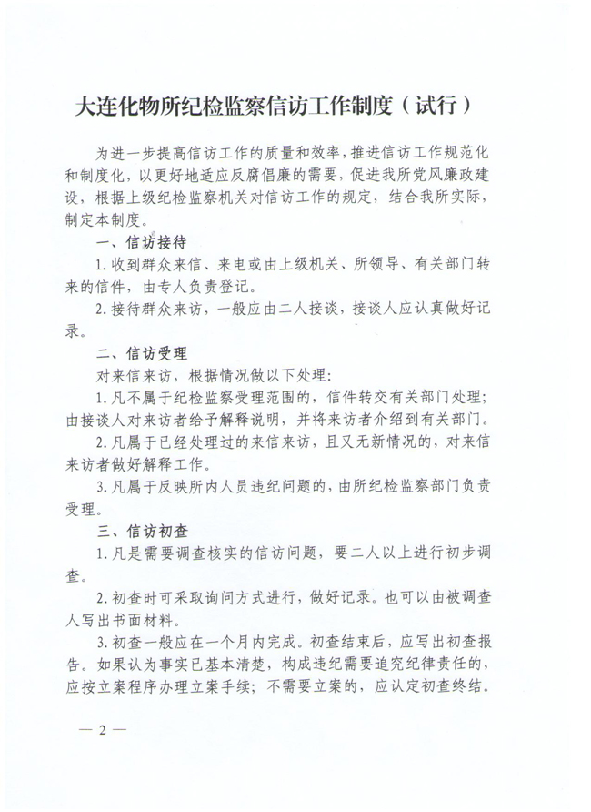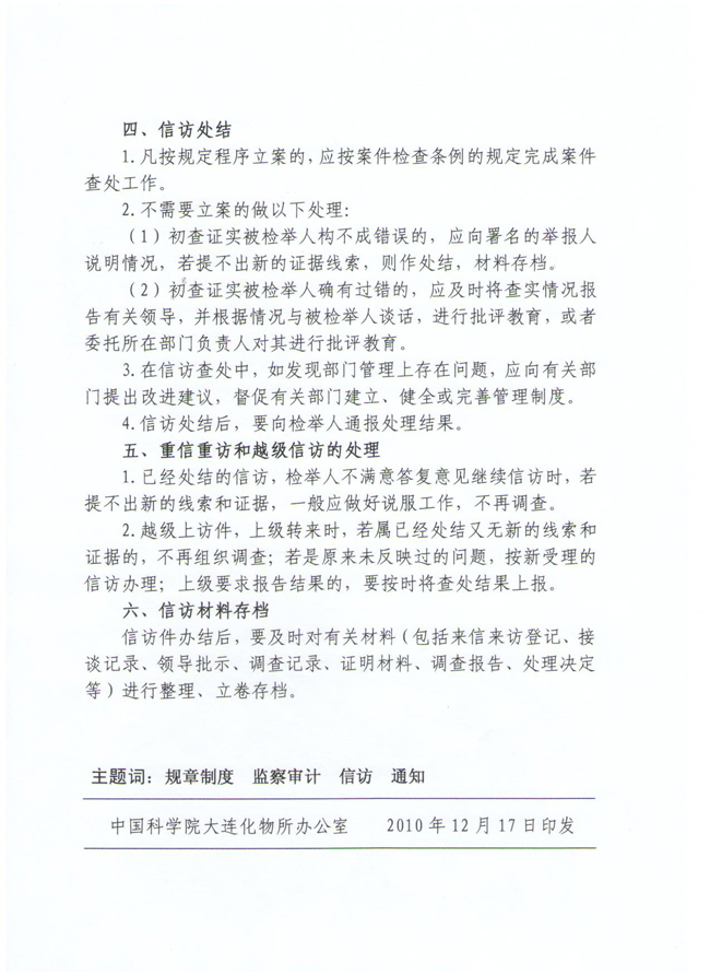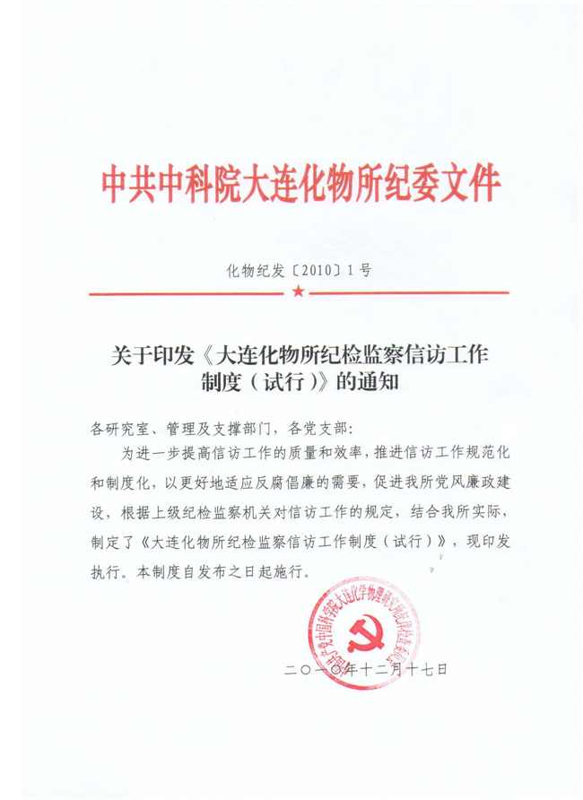 关于印发《大连化物所纪检监察信访工作制度(试行)》的通知