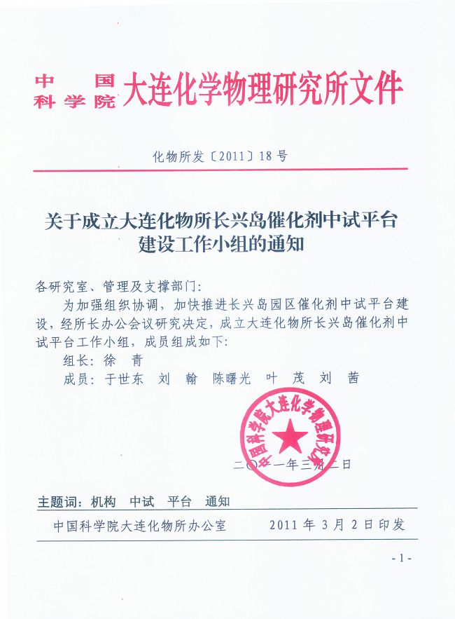 关于成立大连化物所长兴岛催化剂中试平台建设工作小组的通知