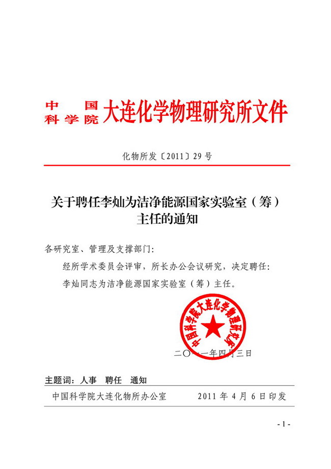 关于聘任李灿为洁净能源国家实验室(筹)主任的通知