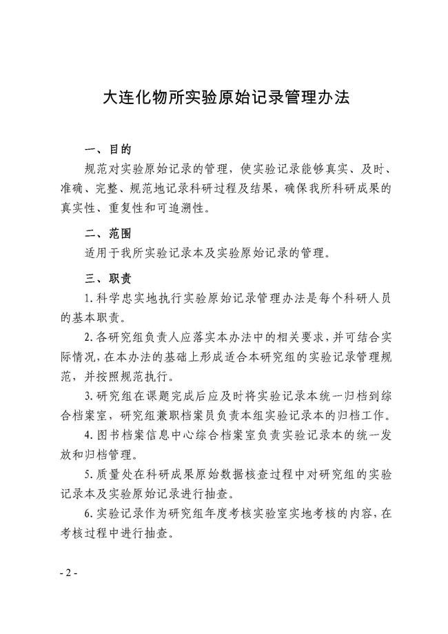 关于印发《大连化学物理研究所实验原始记录管理办法》的通知