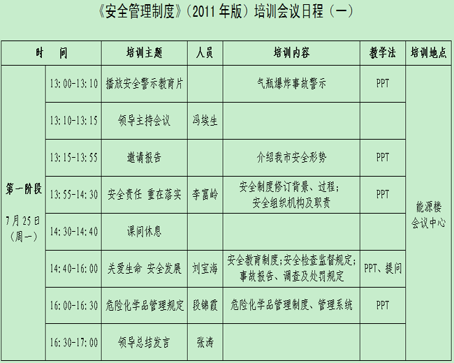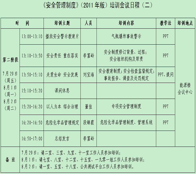 新修订的安全管理制度明确了安全工作职责,请部门负责人务必组织本部门人员参加本次培训。八月下旬将组织针对本次制度培训的安全考试,最后的考评结果将纳入年终安全考核。